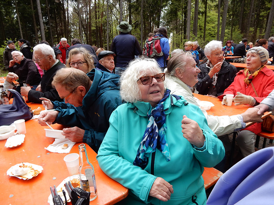„Für uns ist es eine Selbstverständlichkeit, am 1. Mai aufs Hufeisen zu kommen“, meinte eine 82-Jährige in buntem Anorak aus der Lützel. Und auch Landrat Erich Pipa, der zum 11. Mal beim SPD-Fest am Hufeisen-Wegekreuz war, erkannte in den gut besetzten Tischreihen „viele bekannte Gesichter“. Die alljährliche Feier des SPD-Ortsvereins Linsengericht gehört für Viele zur liebgewonnenen Tradition am Tag der Arbeit. SPD-Ortsvereinsvorsitzender Hans Jürgen Wolfenstädter zog daher wie stets ein positives Resumee: „Das Besondere an unserem Fest ist einerseits die Verknüpfung von gemütlichem Beisammensein und politischen Inhalten und andererseits natürlich die Örtlichkeit mitten im Wald, wo aus allen Richtungen Mai-Ausflügler bei uns eine willkommene Rast einlegen.“